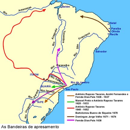 Esses grupos de exploradores, conhecidos por bandeirantes, saíam, entre os séculos XVI e XVIII, do planalto de Piratininga, onde hoje emerge a cidade de S. Paulo, e rumavam ao desconhecido, por sua conta e risco, para materializar o alargamento dos limites territoriais do maior país da América do Sul . Hoje, a nação brasileira cobre uma superfície com 8,5 milhões de quilómetros quadrados.